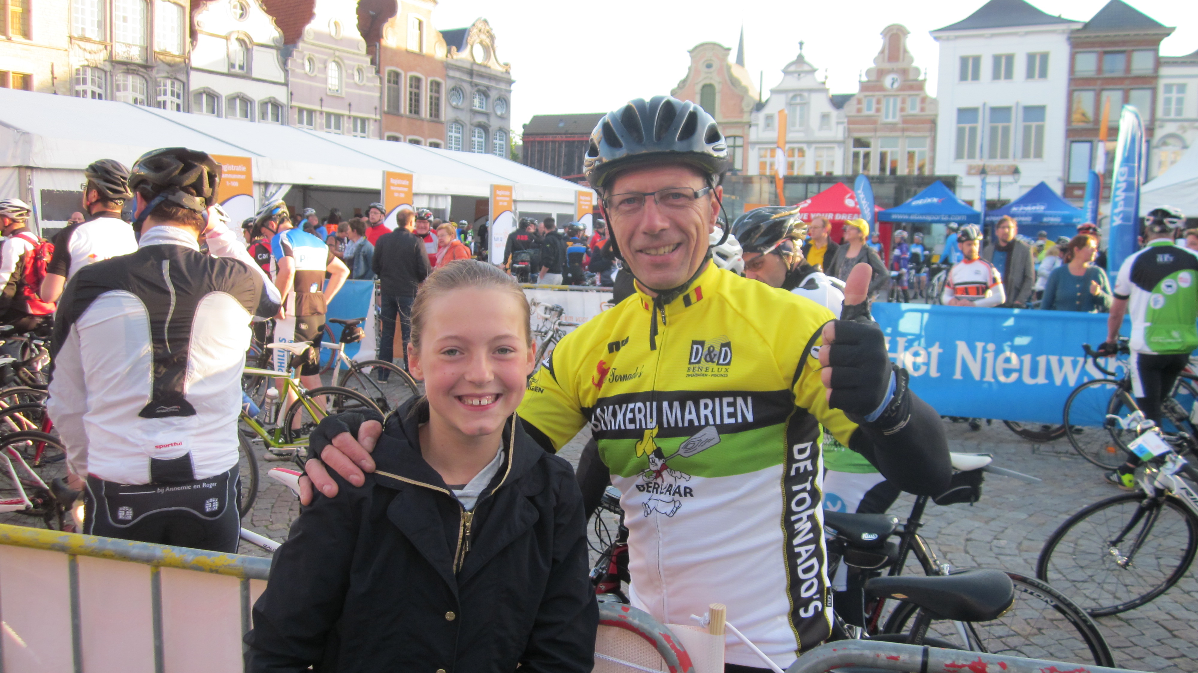 Het was nog fris vanochtend vroeg toen meester Paul de spits mocht afbijten. Een eerste keer meerijden is toch wel bijzonder, echt goed had hij dan ook niet geslapen. Maar hij was enorm fier en blij dat hij zijn steentje kon bijdragen. Er was meteen ook al hilariteit toen uw reporter hem vroeg, alvorens een foto te nemen, welke kant zijn beste kant is. Waarop meester Raoul bliksemsnel en met zijn typische humor antwoordde:’zijn achterkant, natuurlijk’. Jammer genoeg moest meester Paul in een spuuglelijke outfit aan de start verschijnen omdat het ploegtruitje hem niet paste (zegt dat iets over zijn postuur of over de truitjes? 🙂 ). Toen het peloton, dat aan een gemiddelde snelheid van 24 km zal rijden zich klaarzette, dook plots Lexie op om haar meester aan te moedigen. Dat deed hem erg veel plezier. Rond 10 over 7, onder een stralende zon en met een warm applaus vertrok onze meester richting Dilbeek, waar een erehaag hem en en de andere fietsers opwacht. We wensen hem een fijne en veilige rit. Wegkapitein meester Bart vertrok rond half 8 met het peloton dat 27 km per uur rijdt. De indrukwekkende organisatie en de inzet van de vele vrijwilligers die dit prachtige evenement in goede banen leiden, verdienen echt een pluim.