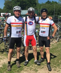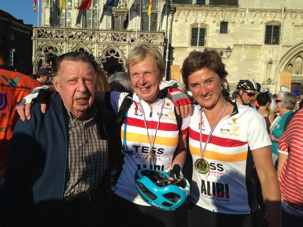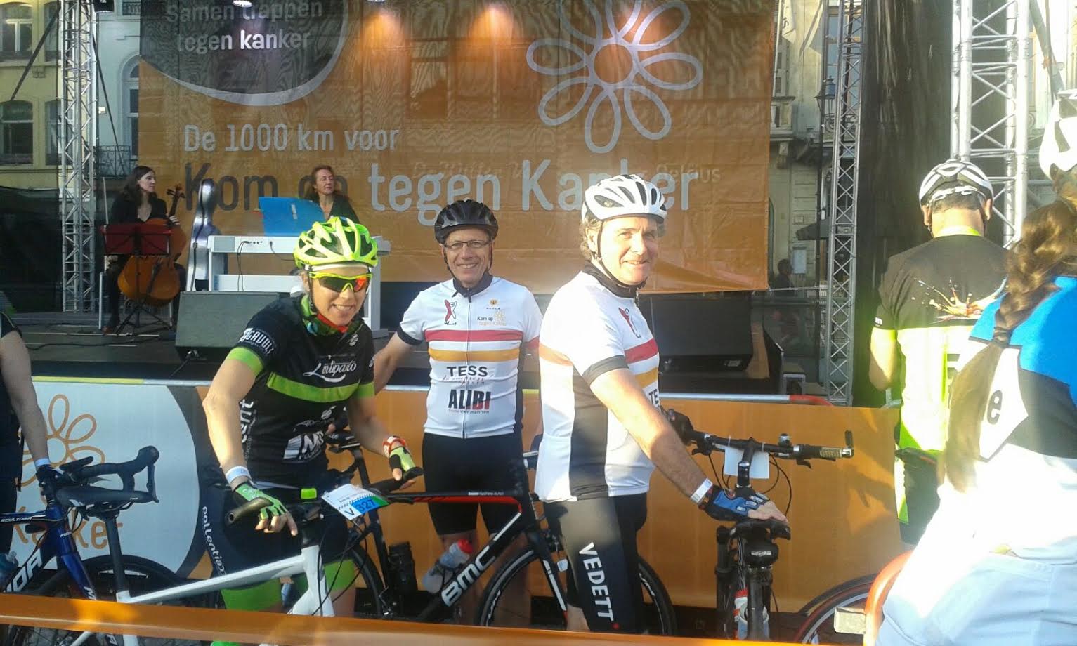 Oudgediende meester Paul en “bleukes” papa Luc, mama Patricia en ikzelf mochten de spits afbijten. Enkele trouwe supporters waren bij het krieken van de dag al op post om Paul en Luc, die om 7 u op de Grote Markt vertrokken, een hart onder de riem te steken. Het duo reed rustig keuvelend richting Bornem, alwaar een enthousiaste massa (waaronder ook Chris, Patricia en ikzelf) voor een oorverdovend onthaal zorgden. “Niet echt moeten trappen”, volgens meester Paul en “een makkie”, volgens papa Luc die de rit op zijn mountainbike zonder klikpedalen reed, maar dat kon ons niet echt gerust stellen :). Voor wat afleiding en een fijne verrassing zorgde meester Raoul, die op zijn fiets gesprongen was om ons onverwacht in Bornem te komen aanmoedigen. Ik slaagde er in zonder fietsplaatje te vertrekken, bleek dat mama Patricia dat per ongeluk (? 🙂 )in de afvalcontainer had gegooid. Wat een gelukkig toevallig dat meester Bart als wegkapitein, ons peloton begeleidde, hij zorgde meteen ook voor een mooi plaatsje vooraan en een VIP-behandeling (wat dat betekent, blijft geheim 🙂 )de rest van de rit. De zenuwen waren vlug voorbij en eens we aan het rijden waren kon het genieten beginnen. Wat een ervaring om in een groep mensen met een hart voor het goede doel te fietsen. De geweldige aanmoediging van de vele supporters onderweg was hartverwarmend. En dan zijn er nog de honderden vrijwilligers die voor een vlotte en lekkere (na)middagstop zorgen, de motards die de pelotons begeleiden, de wegkapiteins die de ritten in goede banen leiden: allemaal mensen zich belangeloos inzetten. Op een moeilijk klimmoment een duwtje in de rug en een warme aanmoediging krijgen van een onbekende vrouwelijke mede fietser, ook dat tekent de sfeer van de 1000 km. Mijn reddende engel nr 2 (nr 1 was natuurlijk mama Patricia, die me geduldig goede versnellingsinstructies en pep talk gaf) heette Kathy en fietste voor haar vriendin, die vijf jaar geleden aan kanker overleed. Een andere mede fietser reed voor de eerste keer solo de 1000 km om zijn 17-jarig nichtje met leukemie te steunen. En zo trapte iedereen wel voor een bijzonder iemand. Dat was voor ons niet anders en de gedachte aan hen, gaf ons vleugels. Voor we het wisten zagen we de St. Rombautstoren opduiken en konden ook wij zeggen: “een makkie” :), maar vooral wat een hartverwarmende, bijzondere beleving. Het onthaal van de collega’s, vrienden, familie én van Matthias natuurlijk zorgde voor een supergrote glimlach, vergezeld van een traantje. Volgend jaar opnieuw, dat weten we nu al zeker!