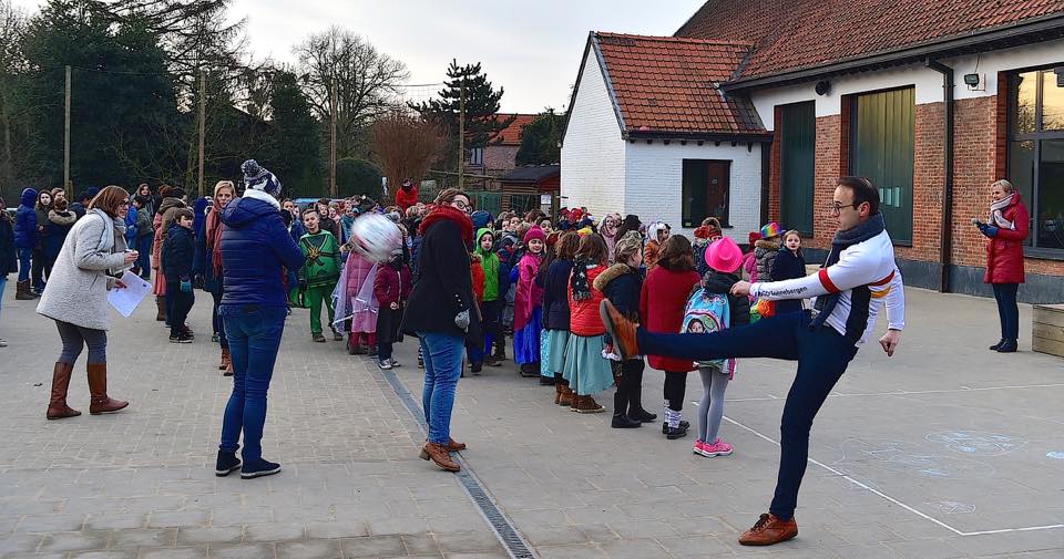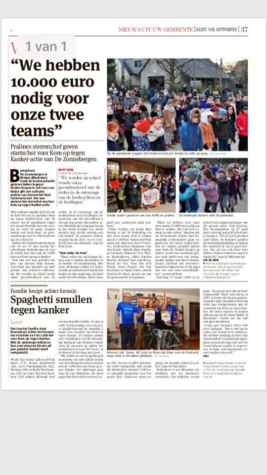 We danken alle ouders die ons kwam steunen tijdens de hartverwarmende kick off. De heerlijke pralines van papa Axel Colonna-Cesari zorgden alweer voor extra geld in het bakje. Emile en Marie brachten de ontroerende tekst “Zij aan zij” tijdens een klein bezinningsmomentje terwijl alle leerlingen en leerkrachten hand in hand even hun gedachten lieten gaan naar al wie met kanker te maken heeft. Daarna zongen we samen luidkeels “wij zijn klaar voor de start”, waarna meester Raoul letterlijk de aftrap gaf van onze vierde editie van ‘De Zonnebergen fietst de 1000 km van Kom op tegen kanker’. Meester Bart zorgde voor de finale door honderden bellen de lucht in te blazen als teken van hoop. http://www.gva.be/cnt/dmf20180209_03348340/we-hebben-10-000-euro-nodig-voor-onze-twee-teams
