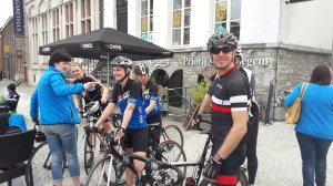 Oudgediende meester Paul en “bleukes” papa Luc, mama Patricia en ikzelf mochten de spits afbijten. Enkele trouwe supporters waren bij het krieken van de dag al op post om Paul en Luc, die om 7 u op de Grote Markt vertrokken, een hart onder de riem te steken. Het duo reed rustig keuvelend richting Bornem, alwaar een enthousiaste massa (waaronder ook Chris, Patricia en ikzelf) voor een oorverdovend onthaal zorgden. “Niet echt moeten trappen”, volgens meester Paul en “een makkie”, volgens papa Luc die de rit op zijn mountainbike zonder klikpedalen reed, maar dat kon ons niet echt gerust stellen :). Voor wat afleiding en een fijne verrassing zorgde meester Raoul, die op zijn fiets gesprongen was om ons onverwacht in Bornem te komen aanmoedigen. Ik slaagde er in zonder fietsplaatje te vertrekken, bleek dat mama Patricia dat per ongeluk (? 🙂 )in de afvalcontainer had gegooid. Wat een gelukkig toevallig dat meester Bart als wegkapitein, ons peloton begeleidde, hij zorgde meteen ook voor een mooi plaatsje vooraan en een VIP-behandeling (wat dat betekent, blijft geheim 🙂 )de rest van de rit. De zenuwen waren vlug voorbij en eens we aan het rijden waren kon het genieten beginnen. Wat een ervaring om in een groep mensen met een hart voor het goede doel te fietsen. De geweldige aanmoediging van de vele supporters onderweg was hartverwarmend. En dan zijn er nog de honderden vrijwilligers die voor een vlotte en lekkere (na)middagstop zorgen, de motards die de pelotons begeleiden, de wegkapiteins die de ritten in goede banen leiden: allemaal mensen zich belangeloos inzetten. Op een moeilijk klimmoment een duwtje in de rug en een warme aanmoediging krijgen van een onbekende vrouwelijke mede fietser, ook dat tekent de sfeer van de 1000 km. Mijn reddende engel nr 2 (nr 1 was natuurlijk mama Patricia, die me geduldig goede versnellingsinstructies en pep talk gaf) heette Kathy en fietste voor haar vriendin, die vijf jaar geleden aan kanker overleed. Een andere mede fietser reed voor de eerste keer solo de 1000 km om zijn 17-jarig nichtje met leukemie te steunen. En zo trapte iedereen wel voor een bijzonder iemand. Dat was voor ons niet anders en de gedachte aan hen, gaf ons vleugels. Voor we het wisten zagen we de St. Rombautstoren opduiken en konden ook wij zeggen: “een makkie” :), maar vooral wat een hartverwarmende, bijzondere beleving. Het onthaal van de collega’s, vrienden, familie én van Matthias natuurlijk zorgde voor een supergrote glimlach, vergezeld van een traantje. Volgend jaar opnieuw, dat weten we nu al zeker!